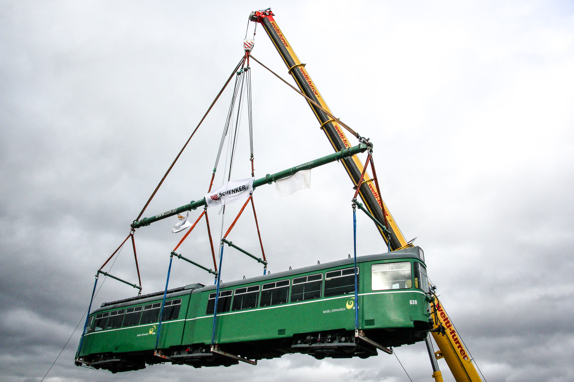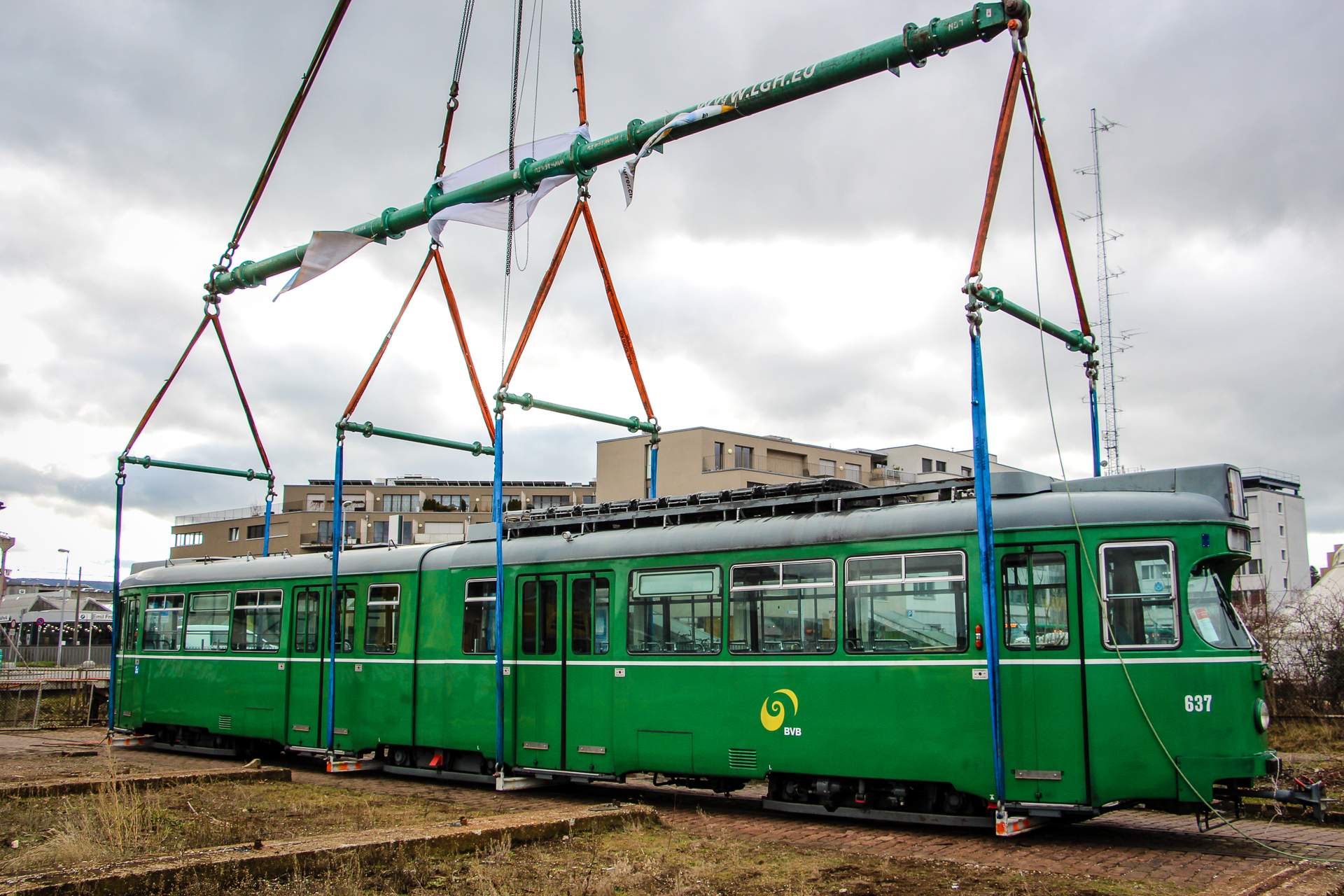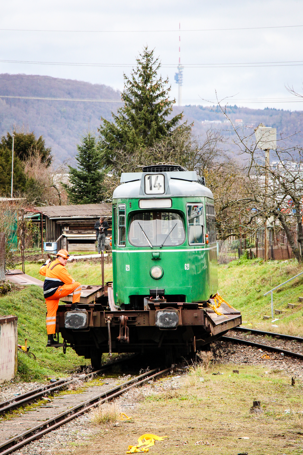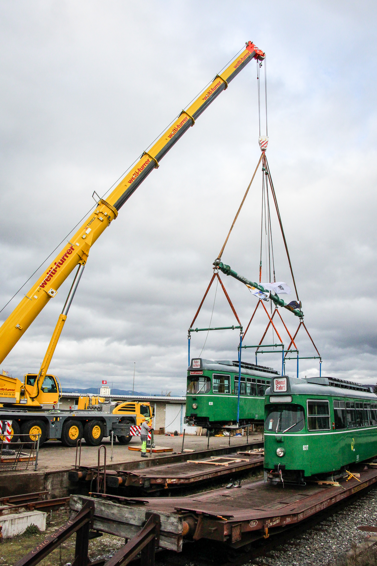 Anfang Februar wurde den Schaulustigen hinter dem Tramdepot Dreispitz ein besonderes Spektakel geboten. Ein schwerer Pneukran hebt ein grünes Tram aus den Schien, lässt es hoch durch die Luft schweben und setzt es dann zentimetergenau auf einem Flachwagen ab. Drei Tage lang sind insgesamt 14 Trams der BVB verladen worden. Sie gelangen mit dem Zug an ihren neuen Bestimmungsort Belgrad. SBB Cargo transportiert das ausrangierte Rollematrial von Basel bis nach Buchs (SG). Wir haben drei «Drämmli» beim Beginn ihrer Reise begleitet.