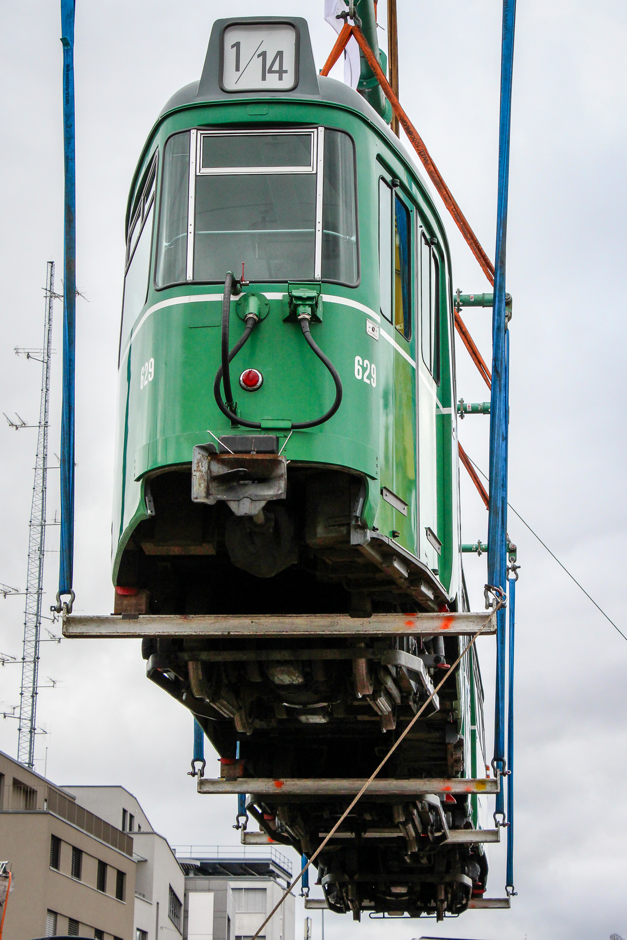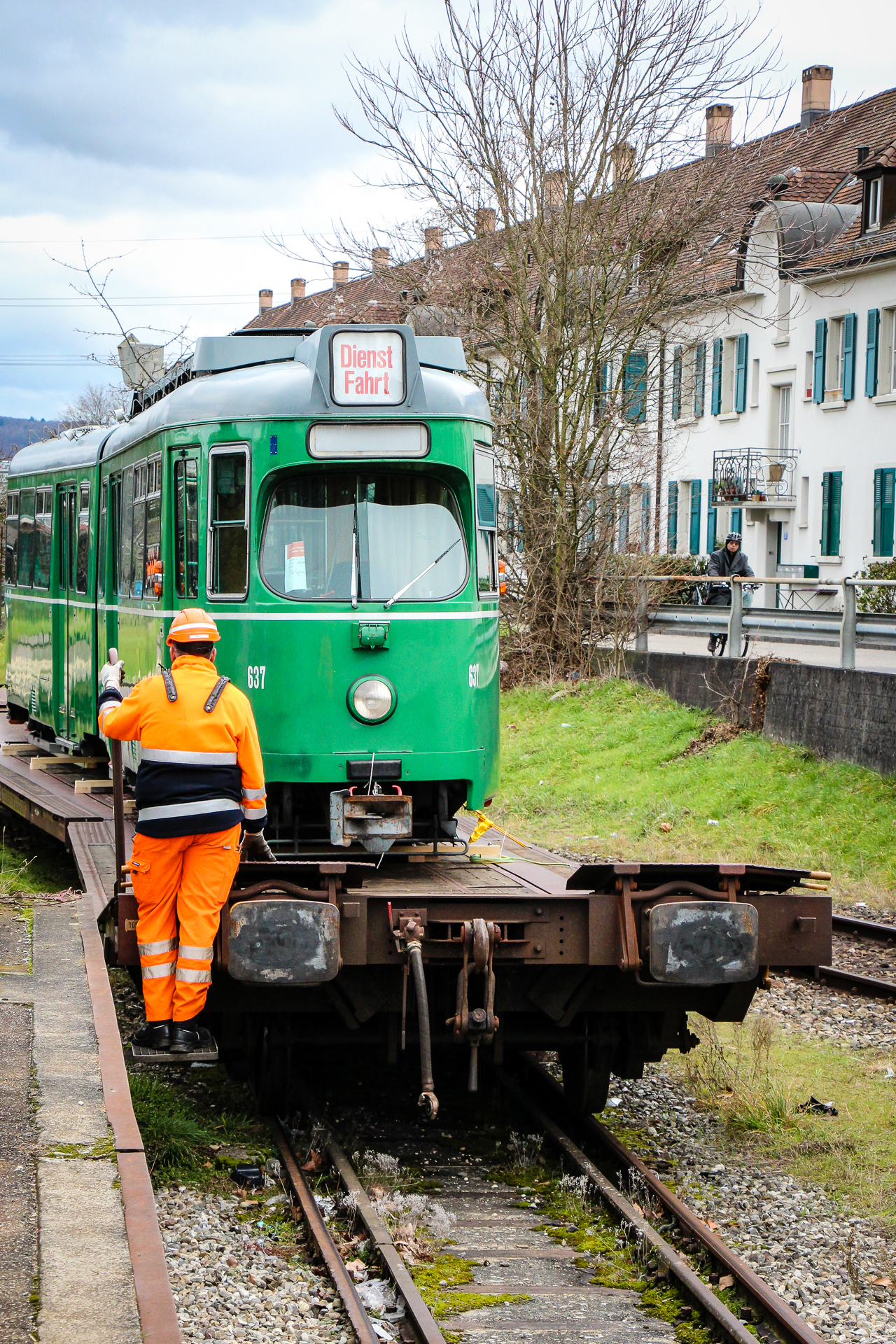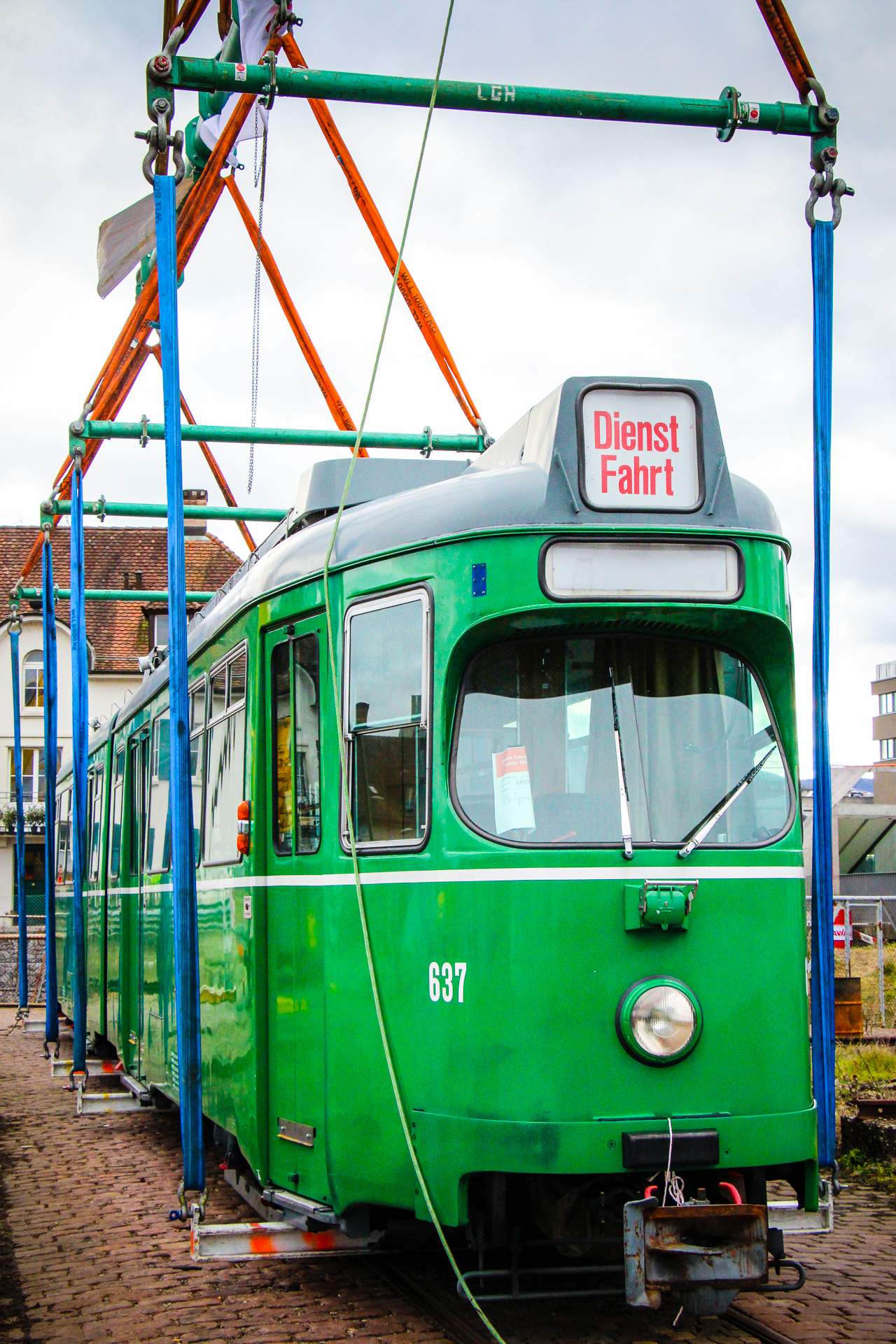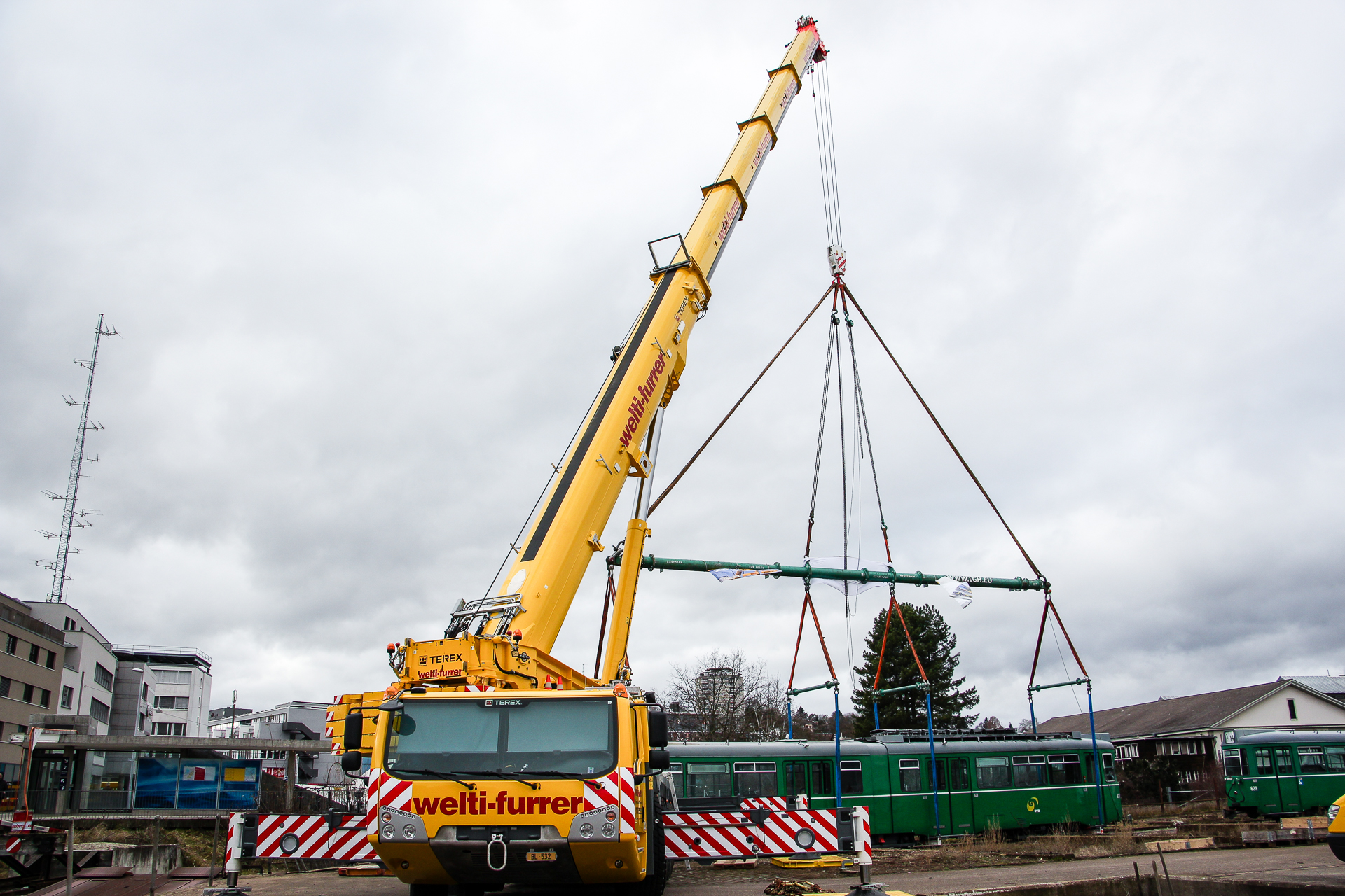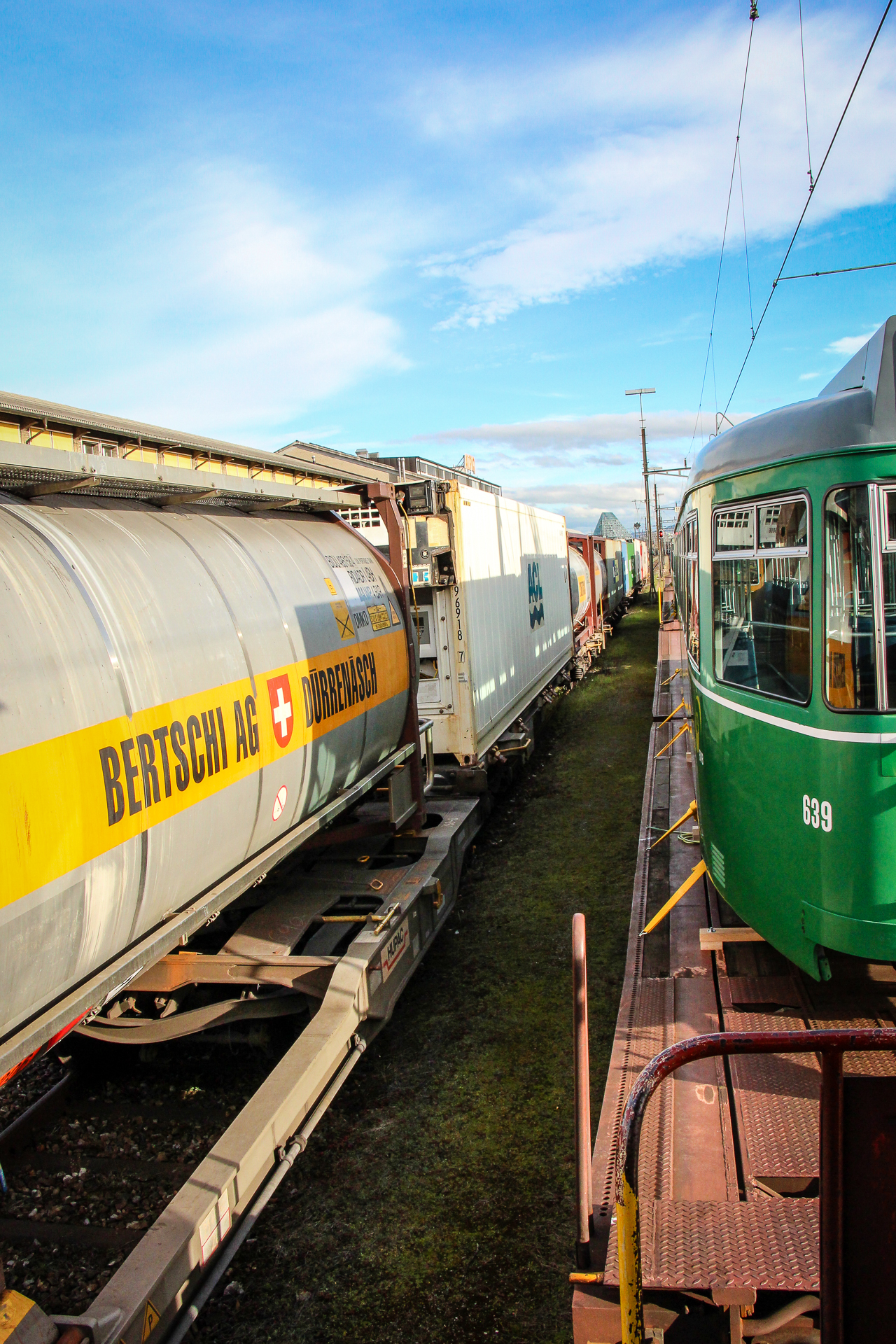 Anfang Februar wurde den Schaulustigen hinter dem Tramdepot Dreispitz ein besonderes Spektakel geboten. Ein schwerer Pneukran hebt ein grünes Tram aus den Schien, lässt es hoch durch die Luft schweben und setzt es dann zentimetergenau auf einem Flachwagen ab. Drei Tage lang sind insgesamt 14 Trams der BVB verladen worden. Sie gelangen mit dem Zug an ihren neuen Bestimmungsort Belgrad. SBB Cargo transportiert das ausrangierte Rollematrial von Basel bis nach Buchs (SG). Wir haben drei «Drämmli» beim Beginn ihrer Reise begleitet.