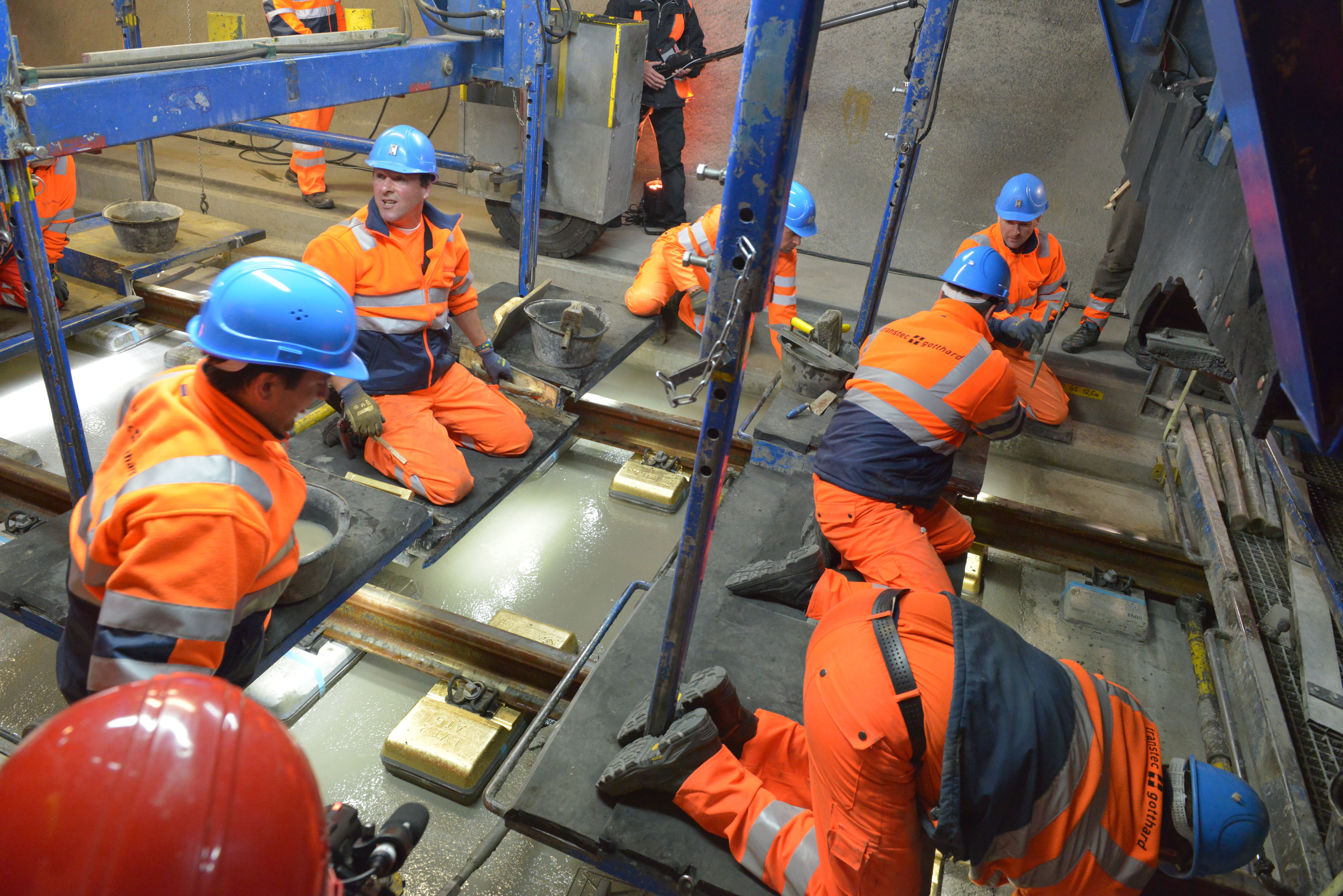 Aujourd’hui 31 octobre 2014, à midi, le dernier élément du radier de la voie ferrée a été construit dans le tunnel de base du Saint-Gothard. L’entrepreneur a coulé la « traverse d’or » à quelques 54 mètres du portail Sud. Il s’agit d’un moment crucial pour tous les acteurs et d’un jalon important pour le projet. Rien que la construction de la voie ferrée a duré à elle seule quelques 39 mois. Ce sont ainsi 290 km de rails qui ont été posés. Dès lors, les deux tubes du plus long tunnel ferroviaire du monde peuvent être entièrement parcourus sur unelongueur totale de 57 km avec des locomotives diesel.
