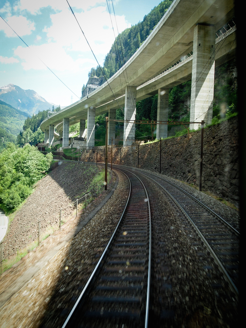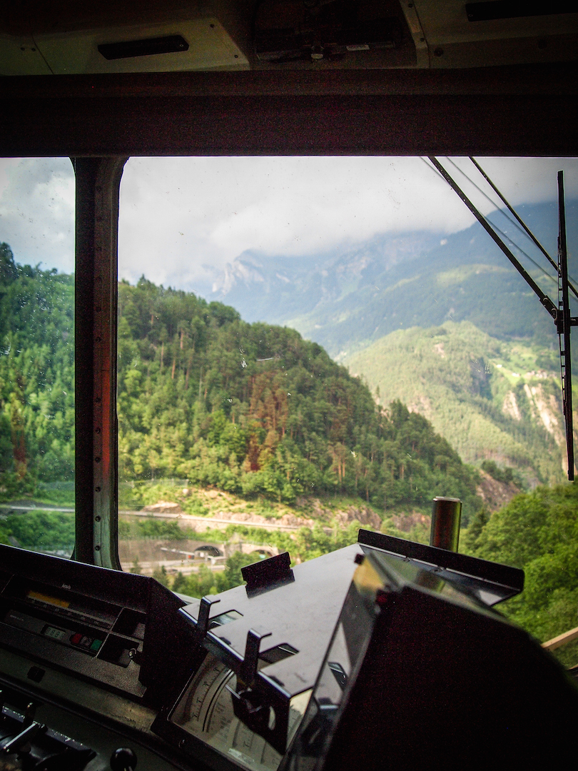 Partenza da Erstfeld. Vista sul Bristen, un simbolo del Canton Uri. Dopo Erstfeld inizia la corsa in salita, con una pendenza del 26 per mille. Questo significa che il treno percorre una tratta di 1000 metri superando un dislivello di 26 metri.