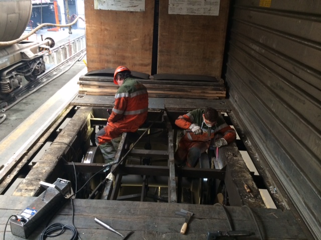 Wir haben Löcher in den Schiebewänden, die wir flicken, wenn etwa ein Gabelstapler dort einen Schaden verursacht. Oder kaputte Trennwände und Böden im Wagen, die durch häufiges Be- und Entladen stark belastet sind. Wenn eine Anschrift am Wagen nicht mehr lesbar ist, ersetzen wir diese. Allerdings machen wir auch präventive Arbeiten und unterhalten die Wagen nach Vorschriften: Wir schmieren Kupplungen und Puffer, kontrollieren die Drehgestelle, messen die Radsätze aus. Es ist ein bunter Mix.