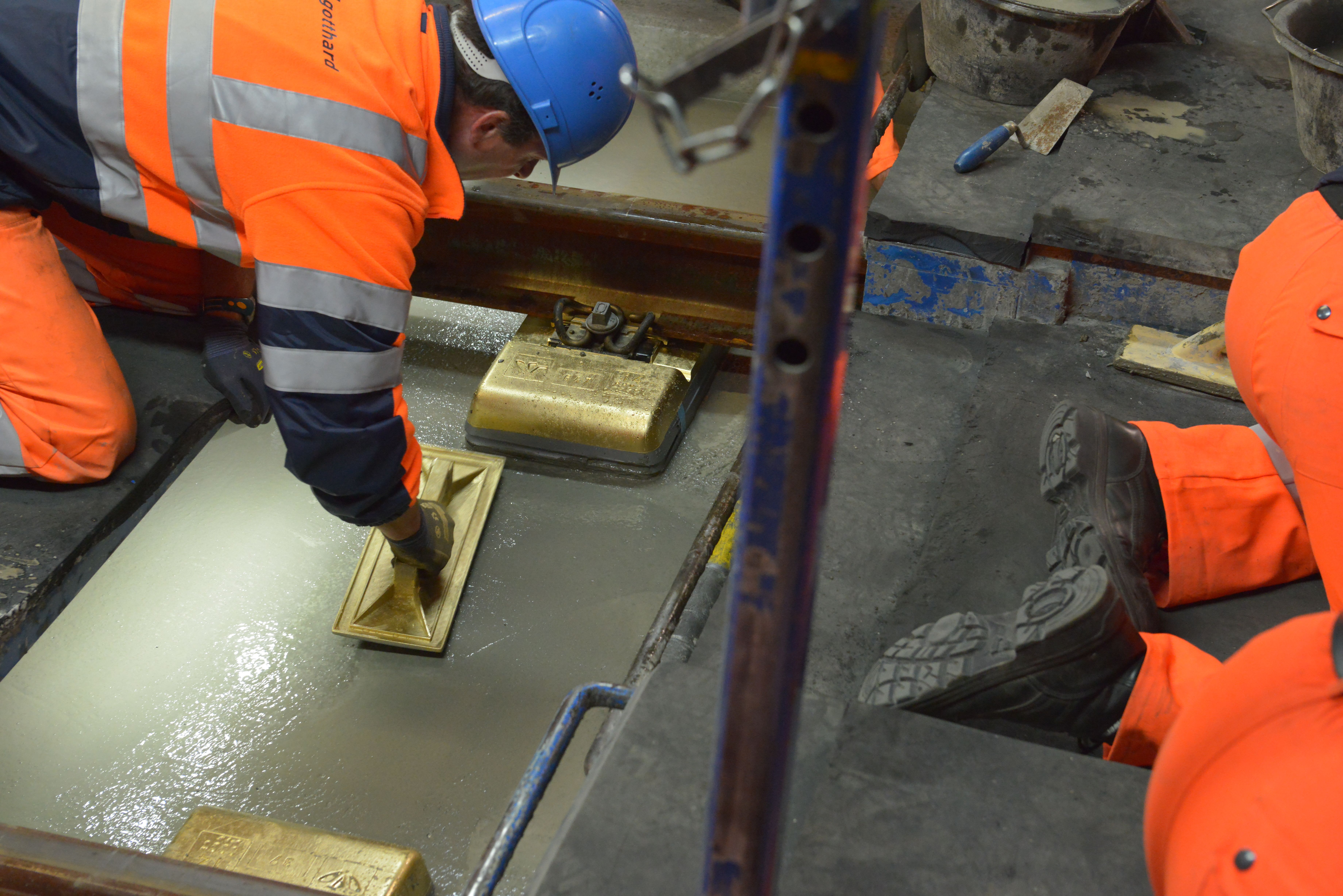 Exakt um 12.00 Uhr heute Mittag hatte der speziell für den Gotthard-Basistunnel entwickelte Betonzug seinen letzten Einsatz. Die «goldene Schwelle» der festen Fahrbahn wurde in einer feierlichen Zeremonie im Tunnel gegossen. Insgesamt hat der Generalunternehmer Transtec Gotthard rund 131‘000 m3 Beton verbaut, 380‘000 Einzelblock-Schwellen in den Tunnel gebracht und 290 km Schienen verlegt. Rund 125 Arbeiter standen im Schichtbetrieb 7 Tage die Woche, rund um die Uhr im Einsatz.
