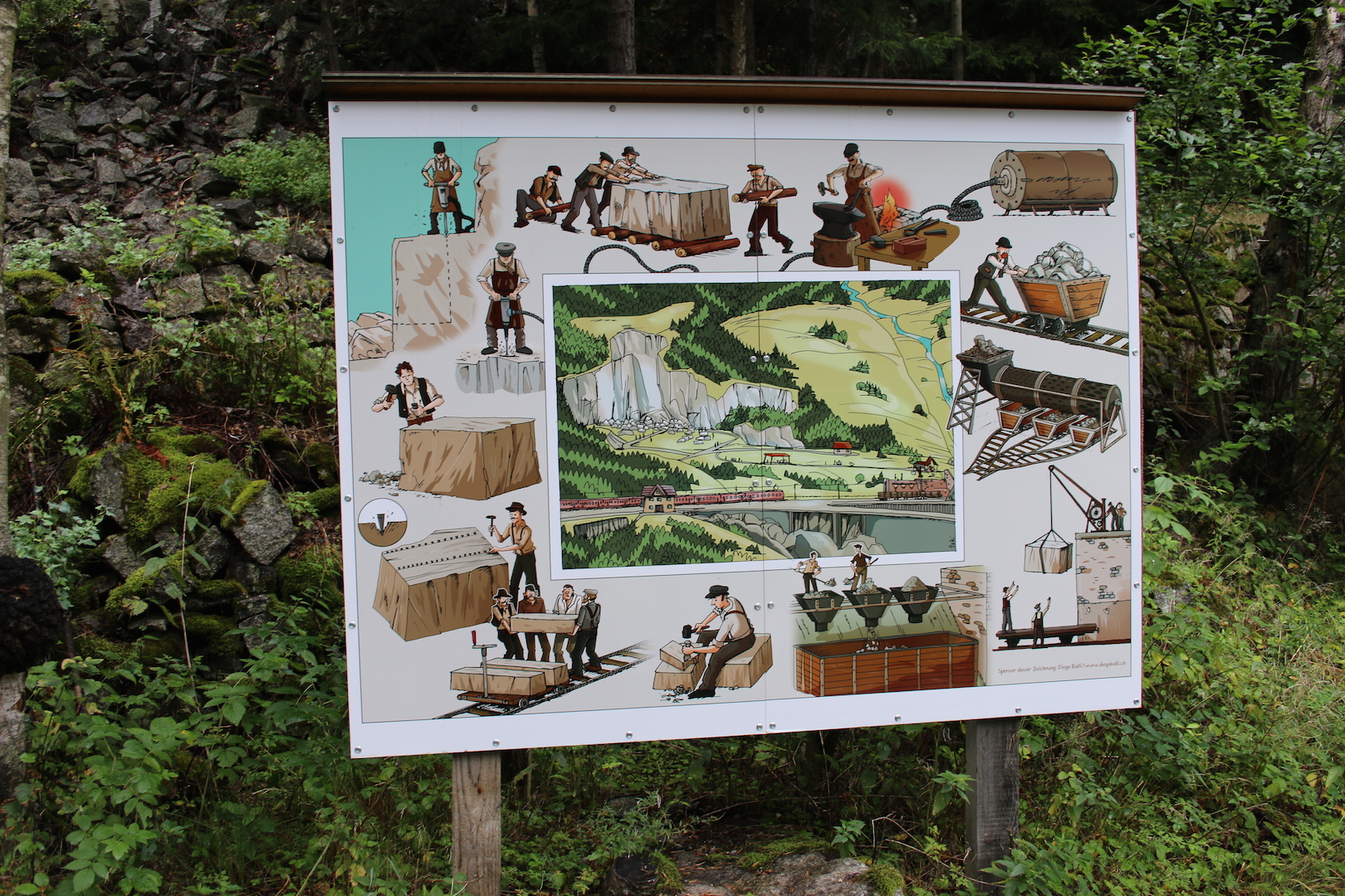 Gleich hinter dem Bahnhof Wassen im Kanton Uri stösst man neben dem Wanderweg auf alte Schienen, die nicht zur Gotthardbahn gehören: Die Spurweite ist viel zu schmal, und sie sind verbeult. Errichtet wurden sie für Wägelchen, die von Hand geschoben wurden und dem Abtransport von Granit dienten. Wir befinden uns im stillgelegten Steinbruch Antonini, das Areal gehört heute der SBB. Hier errichtete der aus Wassen stammende Heinz Baumann mit ein paar Freunden vor drei Jahren ein Freilichtmuseum. Welches ist der Grund für sein Engagement? «Mein Grossonkel hat noch hier im Steinbruch gearbeitet», sagt Baumann später am Telefon.